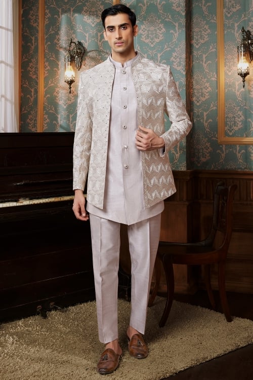 The sherwani is the ideal outfit for anyone looking for a more traditional appearance, especially for events involving Indian culture. A sherwani is a royal ensemble that epitomizes elegance and grandeur. It is a long coat-like garment that is typically embroidered or adorned with complex patterns. This ensemble is ideal for couples wishing to include cultural heritage into their engagement day when paired with a dhoti or churidar pants.